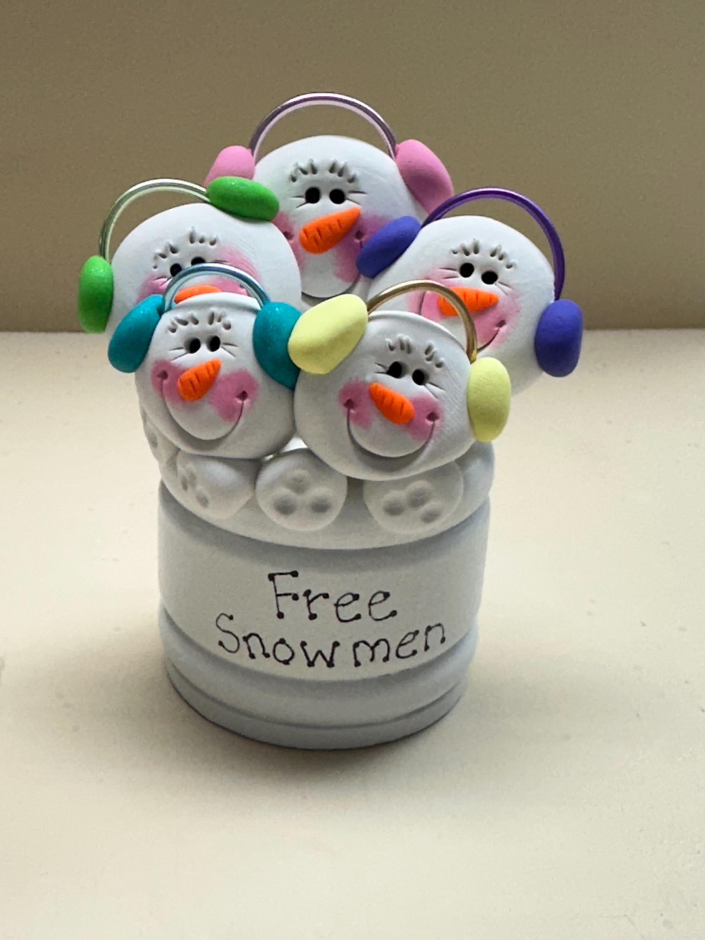 This delightful wooden bucket filled with polymer clay snowmen is a charming addition to your holiday decor.