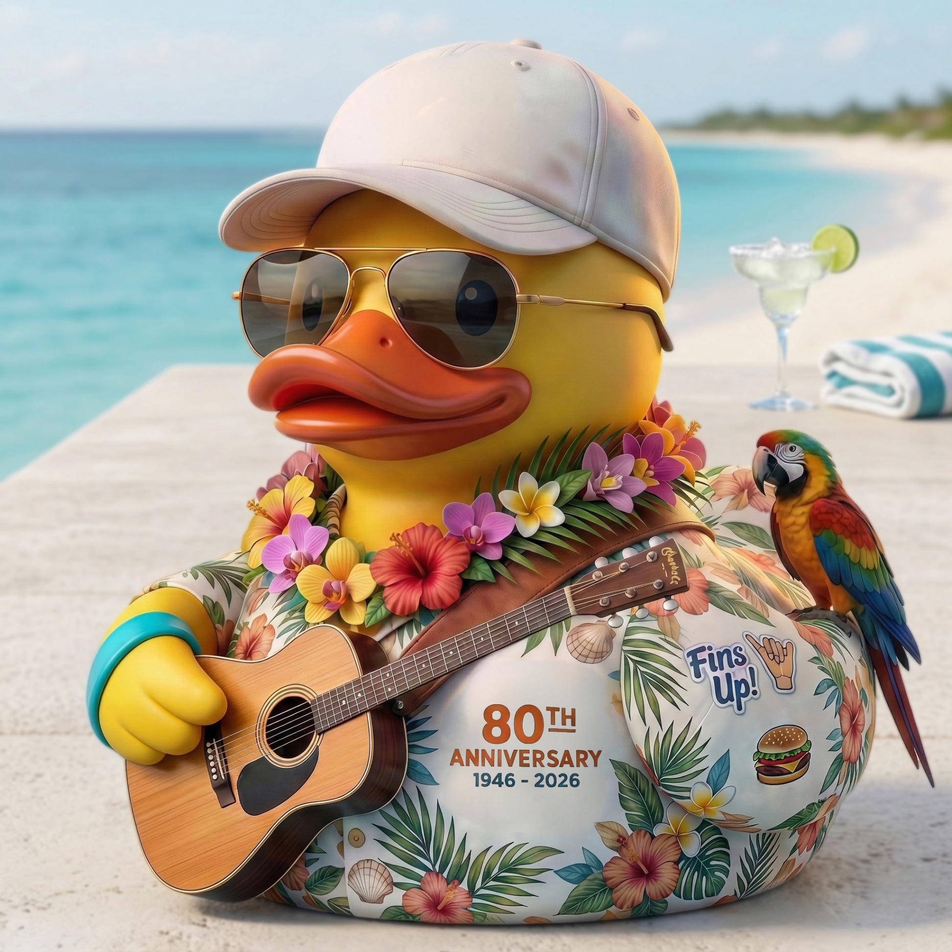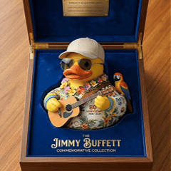 🎸 Celebrate the Legacy of Jimmy Buffett. Marking the 80th anniversary of Jimmy Buffett, this vibrant collectible duck embodies his tropical, laid-back spirit. Featuring a colorful Hawaiian shirt, flower lei, signature cap, and acoustic guitar, it brings the essence of Margaritaville to life. A playful parrot perched on the duck adds a fun, island vibe.