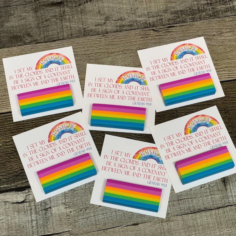 Pass the power of Jesus' love with these religious erasers, printed with the Genesis 9:13 Bible verse. Each eraser reminds us of the story of Noah's Arc.