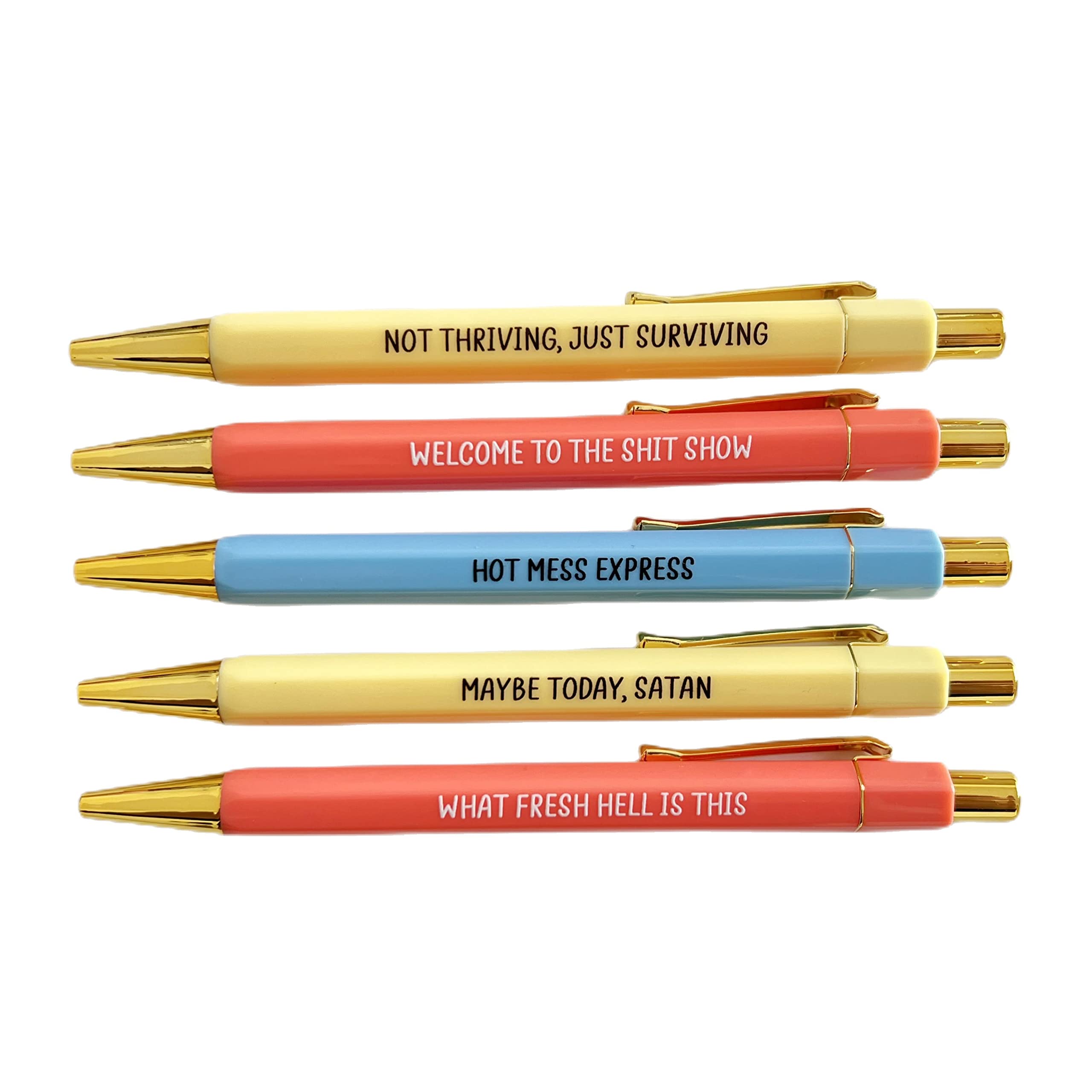 - Relatable Phrases: From "NOT THRIVING, JUST SURVIVING" to "WHAT FRESH HELL IS THIS," these pens echo the sentiments of anyone dealing with life's ups and downs.